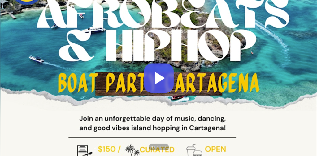 A high-energy island-hopping boat day in Cartagena built around Afrobeats + Hip Hop (often blending in Dancehall/Reggaeton vibes),