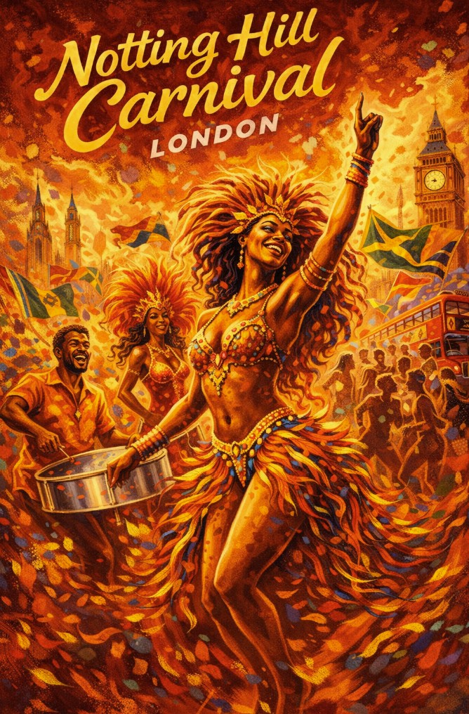 It’s a living expression of Black British and Afro-Caribbean culture — built around music, masquerade (Mas),