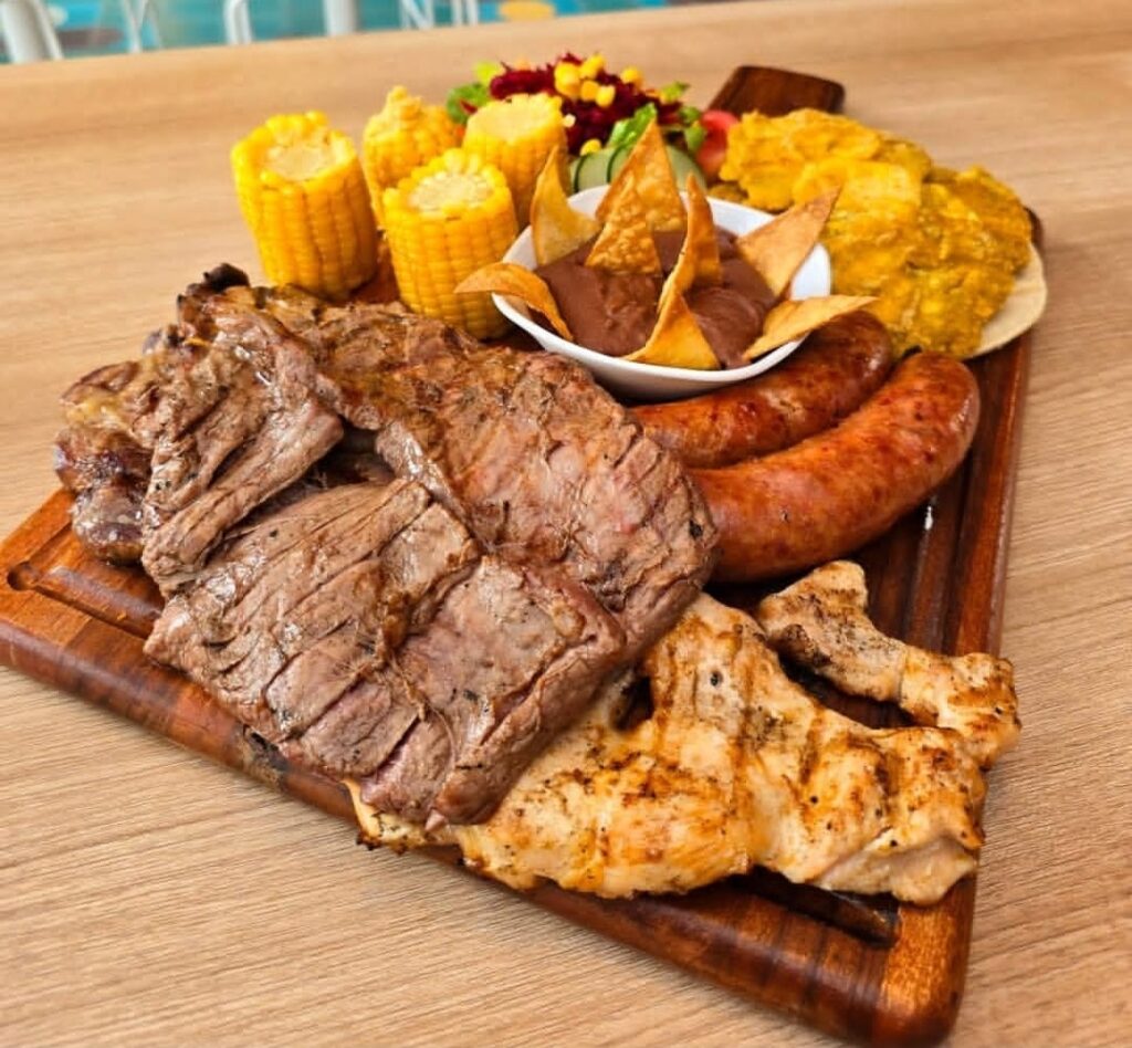 Big ol’ meat platters stacked with grilled chicken, chorizo, steak, and sides like tostones and fire-roasted corn